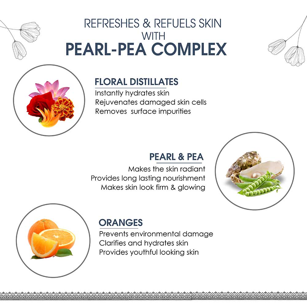 FLORAL DISTILLATES: Floral distillates are created by distilling flowers, and they are known for their hydrating, soothing, and rejuvenating properties. The effective hydrosols of Rose, Butea, Marigold, and Lotus used in it instantly rejuvenate damaged skin cells by removing impurities and grime. They leave the skin super refreshed and satin smooth.